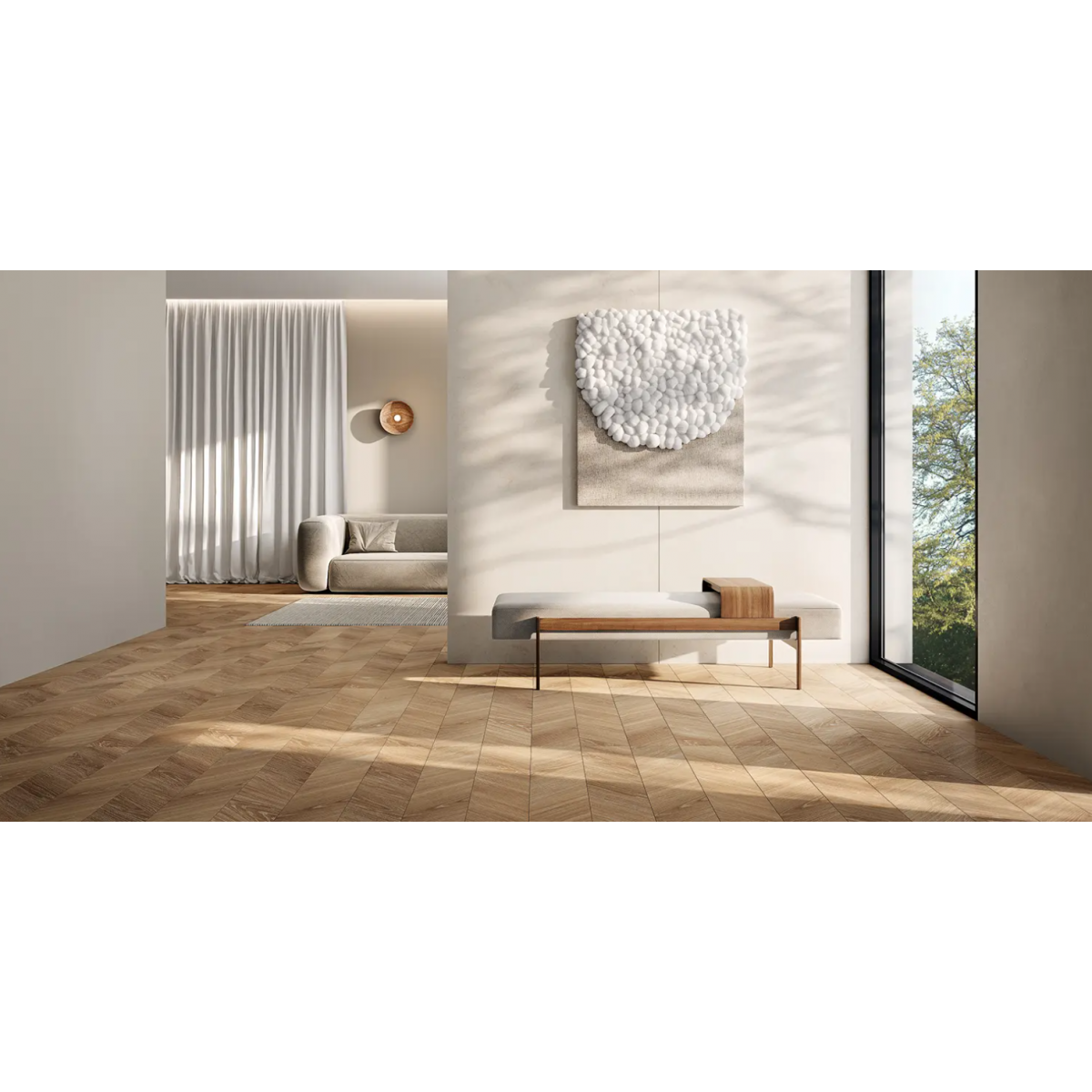 Moderni ir elegantiška Slant Wood Beige A STR plytelė su natūralaus medžio imitacija. Šviesus smėlio atspalvis suteikia interjerui lengvumo ir švaros pojūtį, o struktūrinis paviršius sukuria natūralumo efektą.